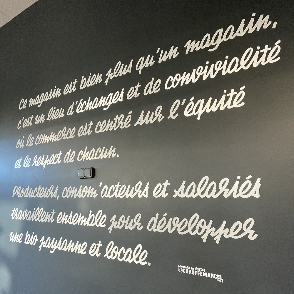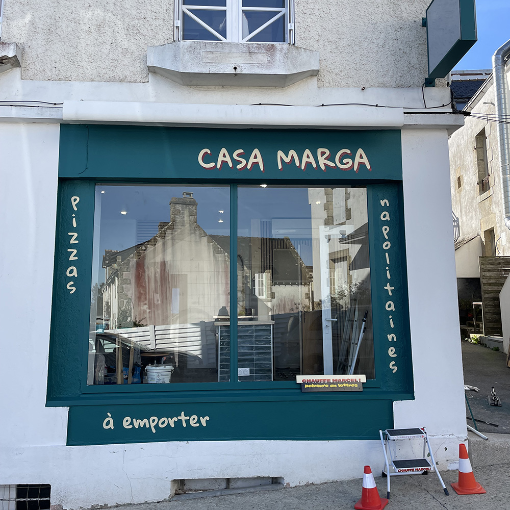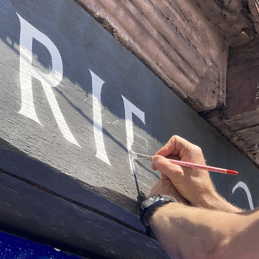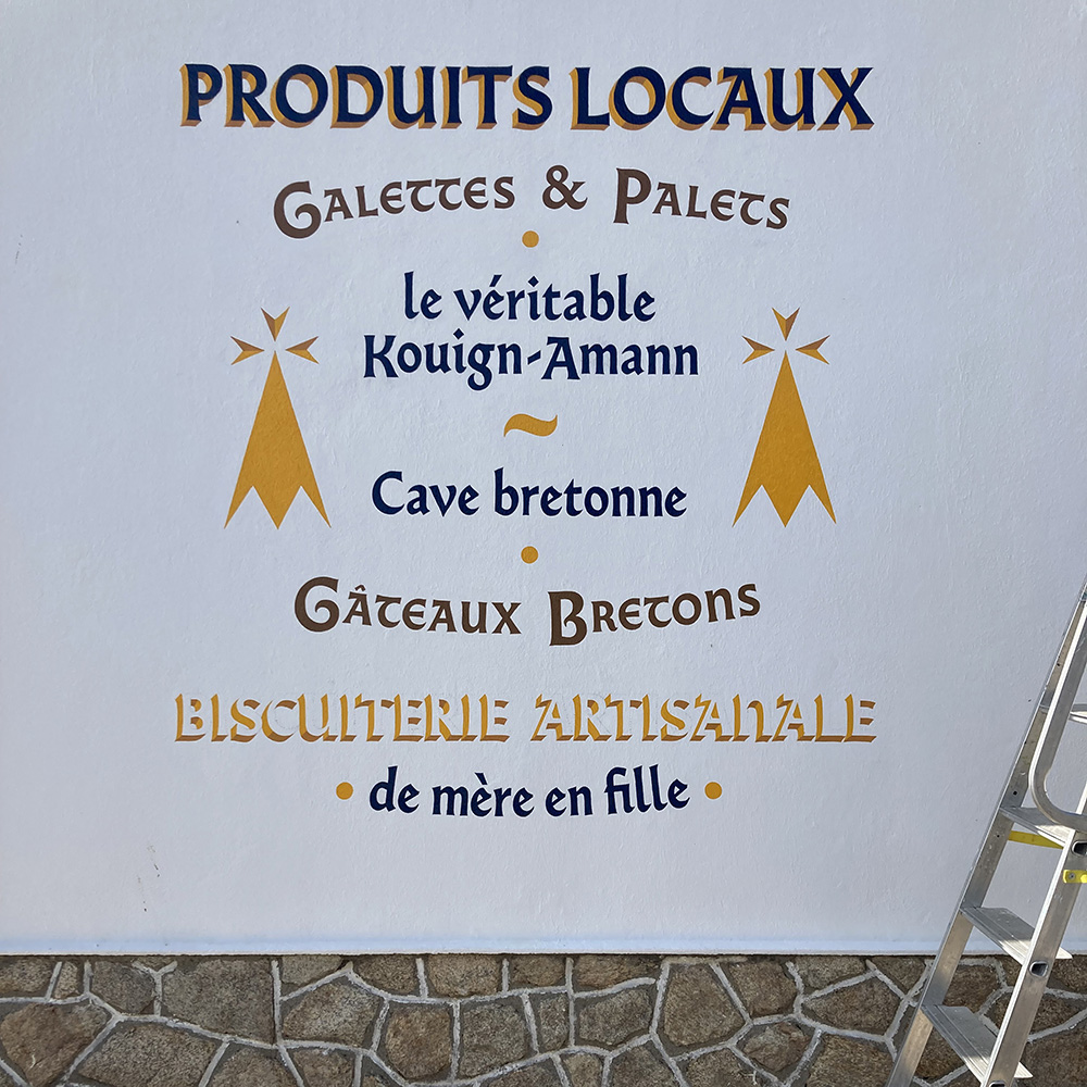 Peinture en lettres sur tout support : enseigne, vitrine, signalétique, enseigne-drapeau, stop-trottoir, lambrequin de store banne, véhicule, bateau... et plus encore !